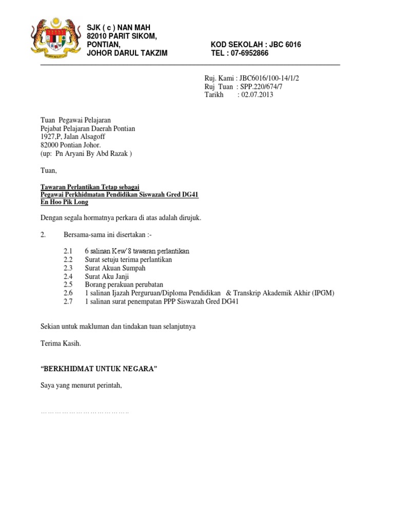 Melalui surat ini saya bermaksud mengajukan lamaran untuk diterima menjadi guru honor di smk negeri 2 makassar. Dalam tempoh 60 hari dari tarikh lapor diri atau tawaran akan terbatal senarai dokumen 1. Demikianlah surat lamaran pekerjaan ini saya buat. * bagi calon lantikan di bawah suruhanjaya perkhidmatan awam malaysia (spa), dokumen setuju terima pelantikan boleh diakses melalui sistem tawaran pelantikan. Jabatan kerja raya daerah kuala muda dan sik: