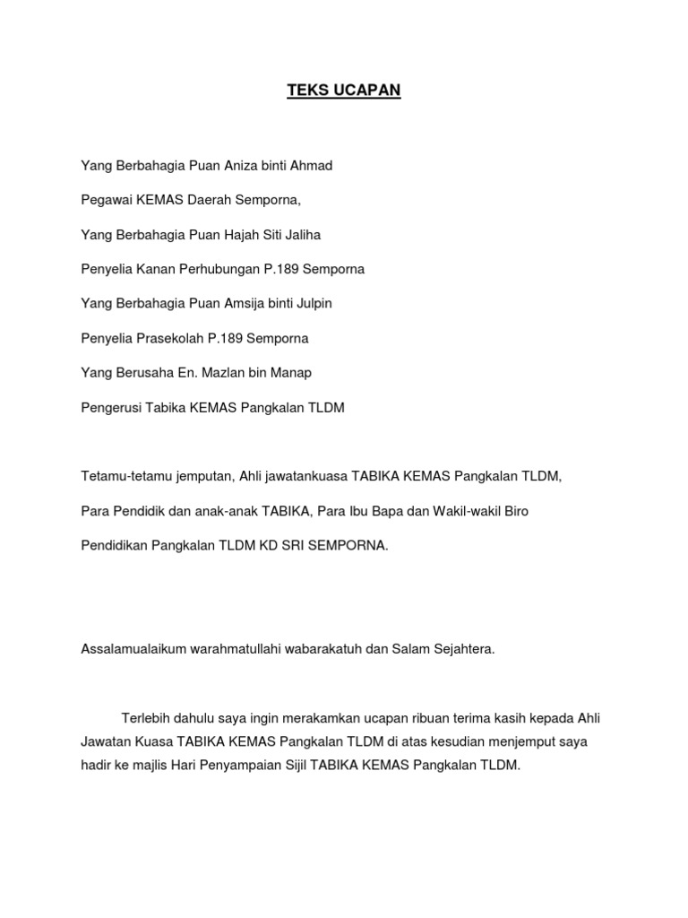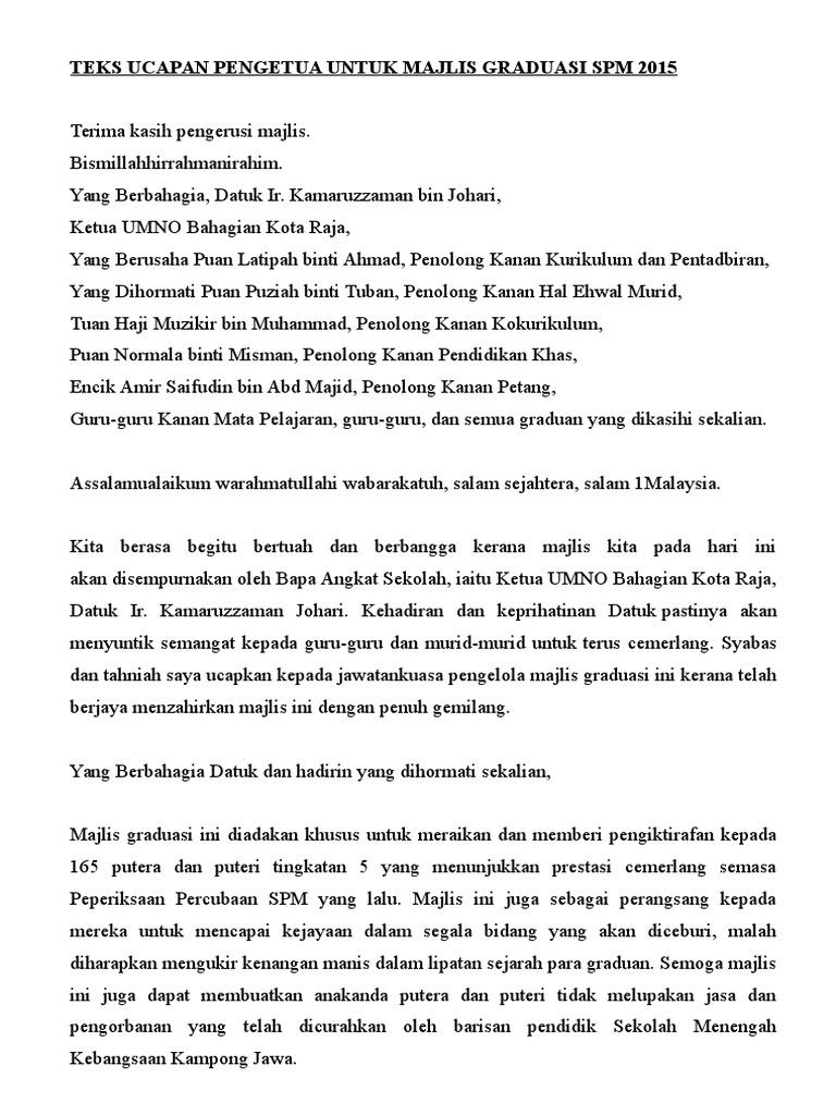 Teks Ucapan Majlis Graduasi / Anugerah perdana rukun tetangga 2021.. Ketua penolong ppd pengurusan sekolah pejabat pelajaran daerah kuala langat selangor darul ehsan 1 2. Teks ucapan majlis perasmian bulan bahasa. Akhir sekali, tahniah dan jutaan terima kasih juga diucapkan kepada semua ahli jawatankuasa kerja majlis dan pihak yang terlibat dalam menjayakan majlis ini. Teks ucapan pengacara majlis sambutan hari raya 2015a.doc teks pengacara majlis perkahwinan Teks ucapan perasmian mesyuarat agung pibg.