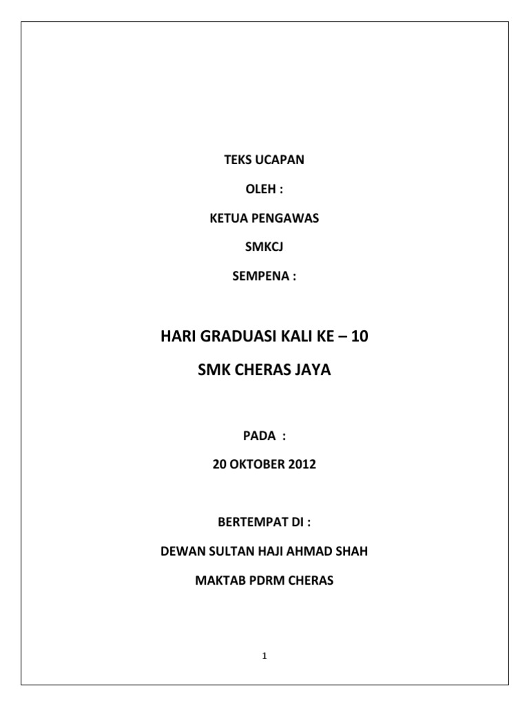 Majlis mengucapkan ribuan terima kasih kepada prof nasa atas ucapan sebentar tadi. Apabila diumumkan ketibaan para tetamu jemputan. Draf ucapan perasmian majlis anugerah cemerlang dan mesyuarat agung pibg smk cheras jaya tahun 2009. Majlis dengan segala hormat mempersilakan. Ucapan perasmian majlis graduasi 1.