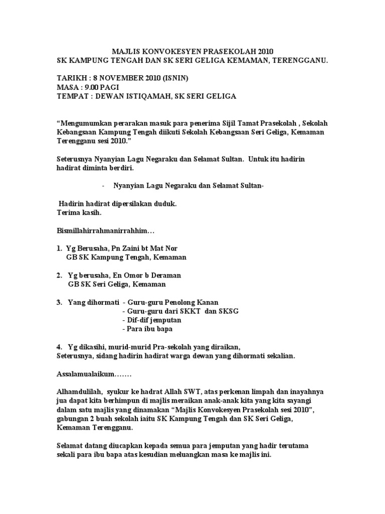 Bersyukur saya ke hadrat allah s.w.t kerana dengan limpah kurnianya dapatlah saya sekeluarga melaksanakan majlis perkahwinan anak saya.dengan pasangannya. Pengerusi puspanita jajahan gua musang. Ketua penolong ppd pengurusan sekolah pejabat pelajaran daerah kuala langat selangor darul ehsan 1 2. Majlis mempersilakan tuan haji muhammad haji harun yang dipertua bakerp bagi menyampaikan ucapan aluan. Teks ucapan pengetua sempena majlis graduasi t5 2004. Pihak majlis merakamkan penghargaan terima kasih kepada yang berusaha pn siti hawa bt abd majid, gpk akademik smk dato mohd taha yg telah sudi menyampaikan ucapan dan seterusnya menutup secara rasmi bulan. Teks ucapan majlis pelancaran transformasi pendidikan vokasional. Berikut adalah teks ucapan pengacara majlis bagi mesyuarat agung tahunan bakerp kali ke sembilan yang diadakan pada 23 jun 2011. Teks ucapan pengacara majlis mesyuarat agung tahunan miharu hime. En abdul hamid bin abd majid. Majlis persaraan pegawai pendidikan merupakan sebahagian tatacara operasi piawai atau s.o.p. Graduan wajib memakai jubah yang disediakan oleh pihak pusat dengan mengikut tertib seperti berikut: Teks ucapan majlis penetapan target.